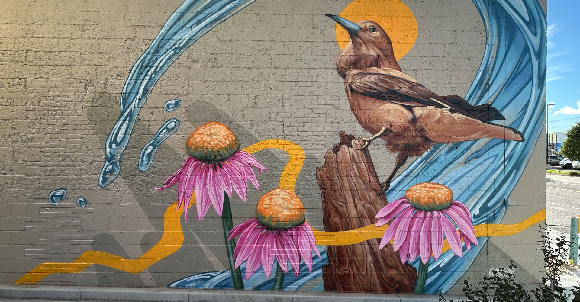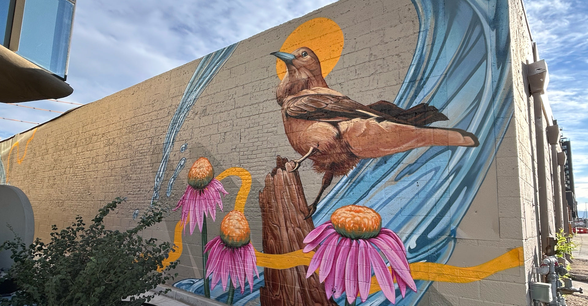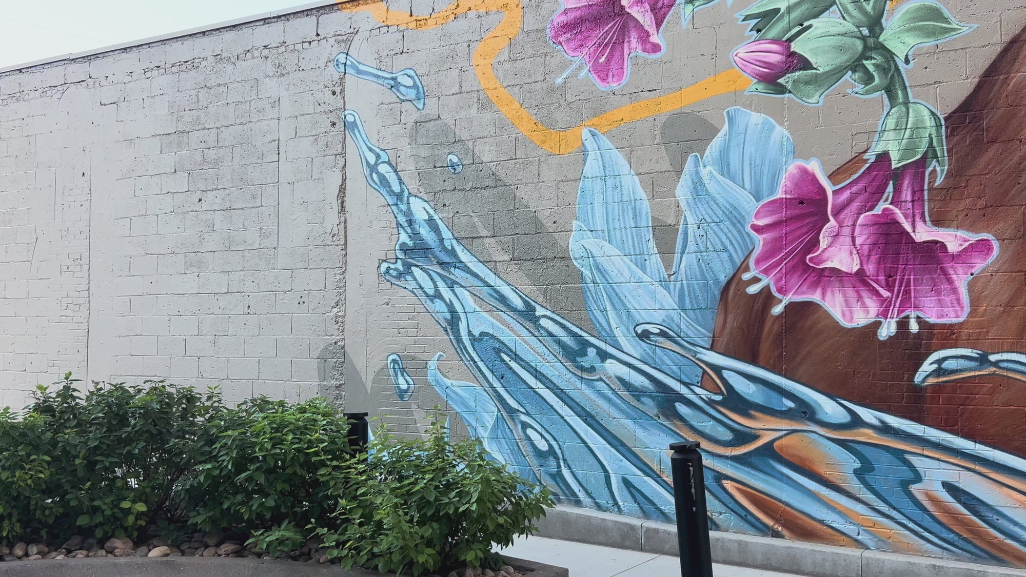 The finished mural transforms the space and brings a new vibrant energy to the area.