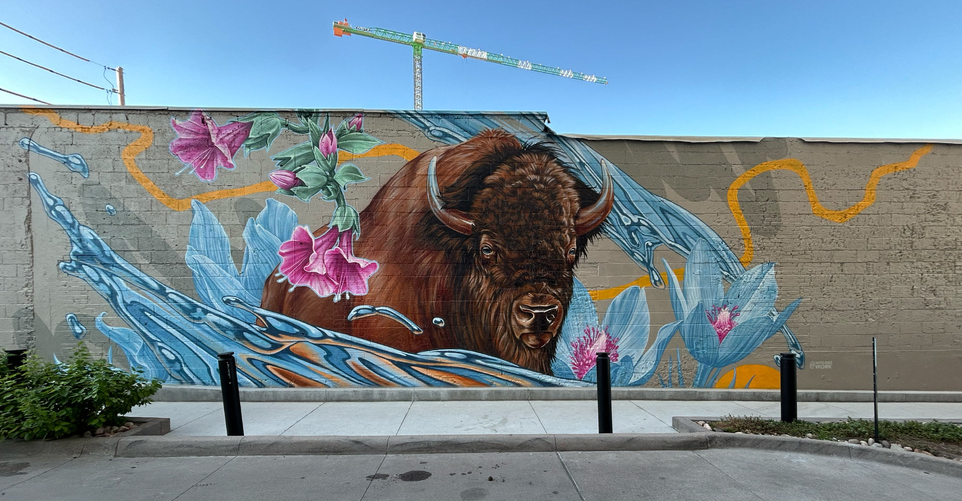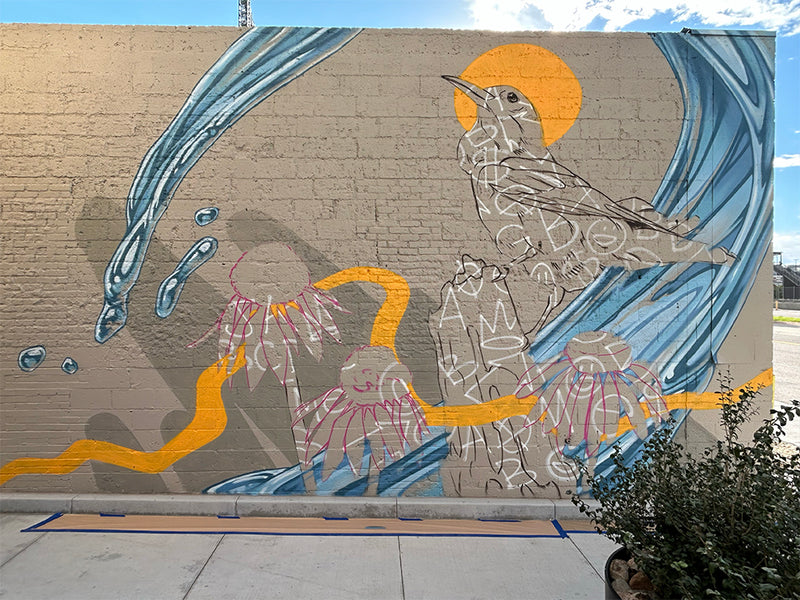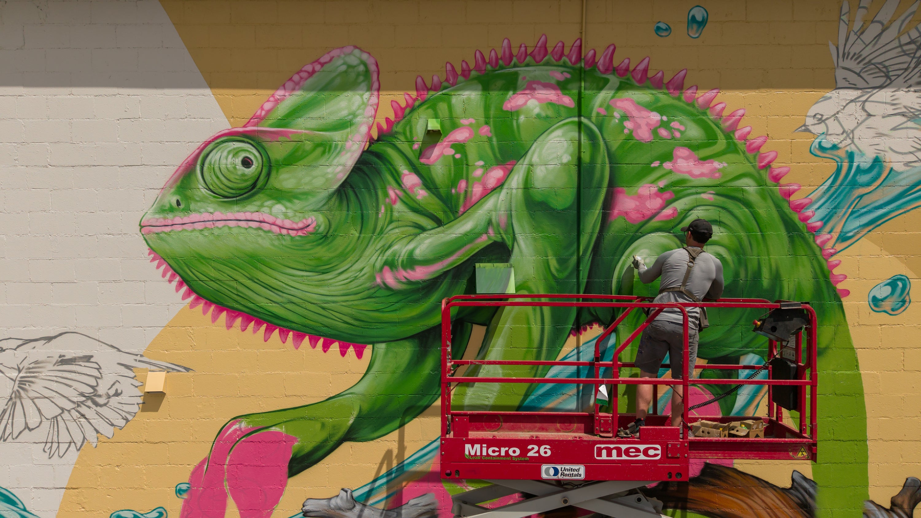 The finished mural transforms the space and brings a new vibrant energy to the area.