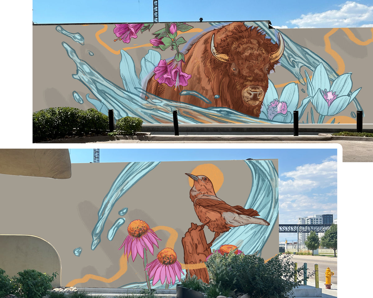 The design evolves and changes as I fully render it. The initial design is just a rough draft, the mural begins to take life as I paint. This is my favorite part!